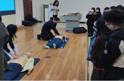 培训会现场,参会同学进行了一对一实践操作培训,使同学们更好地掌握到心肺复苏这项技能。