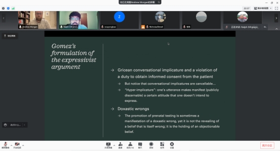 首先,Andrew Morgan老师讲述了涉及基因选择的表现行为,并以选择性堕胎为例进行解释,并且进一步拓宽了表现行为的超越遗传选择的概念,讨论体外受精这一例子,提出拓宽基因选择在个人层面的维度,并使其扩展到群体层次的疑问。然后,Ralph Difranco 讲师介绍了Gomez(戈麦兹)的何时推广选择性堕胎产前检测是错误,使用来自语言哲学的理论工具为手段完善反对产前的测试。对于之前的表达主义者论点的构想,由于缺乏“语言支持”,即他们没有办法解释贬低性的传递信息和对于有害影响的呼吁,促进产前检测有时是一种错误的表现,通过超隐性的表达,使得传递的话语变得令人反感。