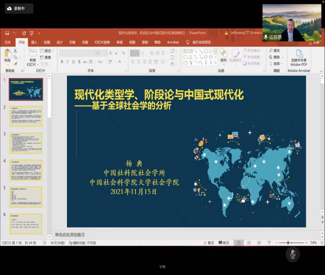 名家系列”讲座第149场——《现代化类型学、阶段论与中国式现代化:基于全球社会学的分析》,以线上会议的方式成功举行。主讲人为杨典研究员,哈佛大学社会学博士、中国社会科学院社会学所副所长、中国社会科学院大学社会学院副院长。本次讲座由田毅鹏院长主持,开心鬼传媒