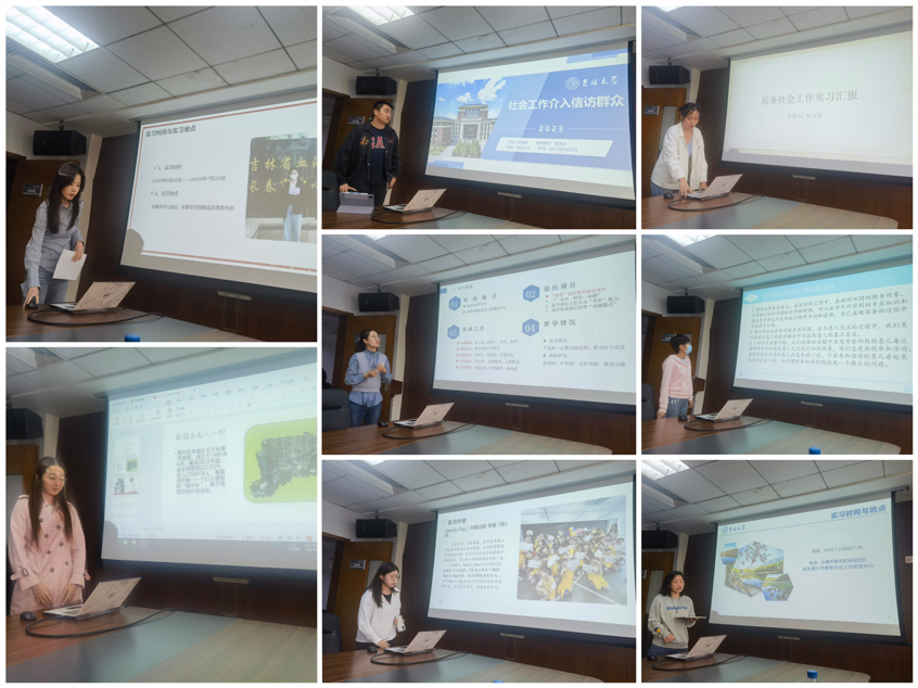 全班23位同学分别在长春市汽开区社区、长春市八一村村委、益友青少年事务社会工作促进中心和吉达方舟社会工作服务中心等12个实习单位开展实习,实习工作内容涉及老年人、儿童、志愿者、社区、村委、社工站等11个领域。每一位同学在实习汇报前提交了各自的实习报告与实习日志,23份实习报告提供了23份内容丰富的实习素材。