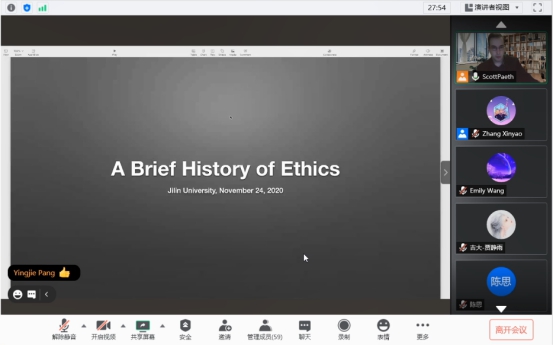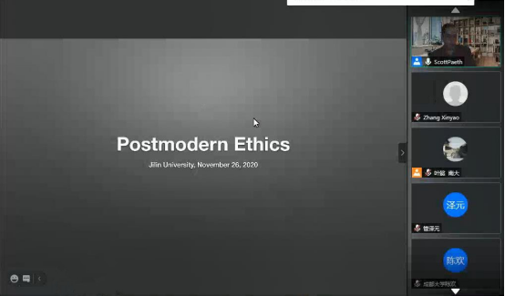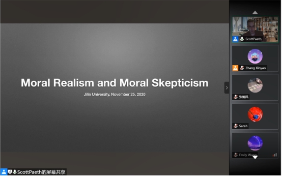 哲学基础理论研究中心主办并由美国德保罗大学Scott Paeth教授主讲的Moral Skepticism and Ethics系列讲座成功于线上举办。本系列讲座主要概述了道德认识论、元伦理学以及伦理学理论在生活道德经验中的应用。Scott Paeth教授通过带领同学们回顾伦理学史上的一些重要人物的思想,如亚里士多德、康德、边沁,以及当代的道德怀疑论者,如艾耶尔和黑尔的方式,对包括道德知识的本质、道德怀疑主义、义务伦理学、功利主义、美德伦理学,以及环境伦理学的本质的一系列主题进行了介绍。Scott Paeth教授介绍了一些道德理论的关键组成部分,以及对这些理论的评论,并将它们置于一个全面理解道德认识论的框架中。