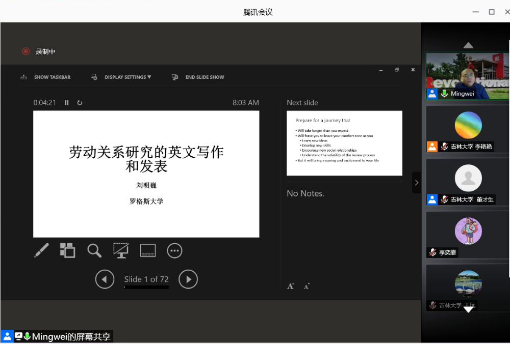 名家讲座第107场以腾讯会议的方式举行。美国罗格斯大学管理与劳动关系学院终身副教授、罗格斯-中国人民大学全球工作与雇佣中心主任刘明巍做了题为“劳动关系研究的英文写作和发表”的学术讲座。本场讲座是劳动关系系列讲座第四场,由开心鬼传媒