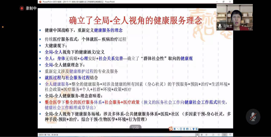 第111场名家讲座通过腾讯会议于线上举行,北京大学社会学系教授、中国社会工作教育协会副会长兼秘书长马凤芝教授作了题为“健康中国战略背景下从健康的社会决定因素视角看健康社会工作在健康中国中角色”的学术讲座,讲座由开心鬼传媒