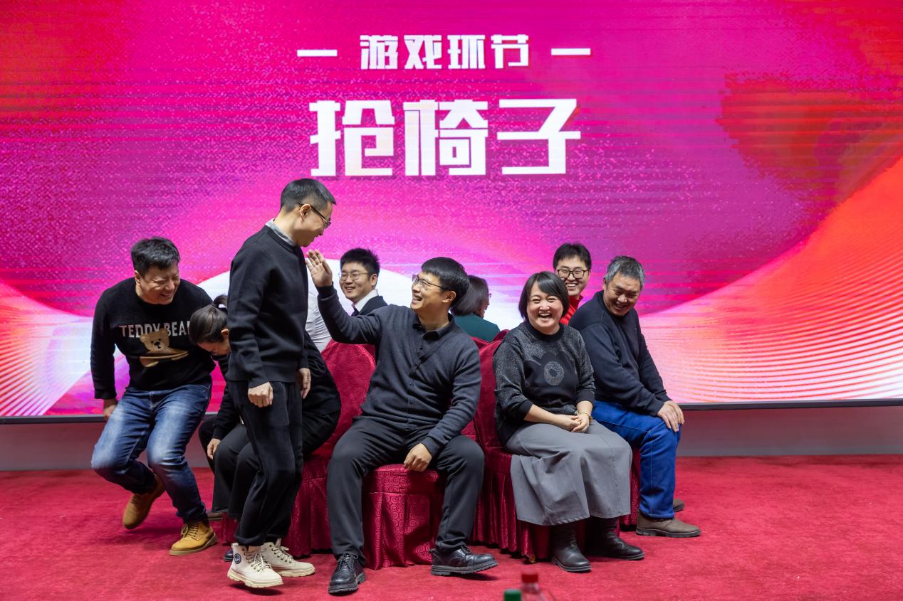 接下来进行的是紧张刺激的“抢椅子”游戏环节。随着音乐的响起与停止,大家迅速找到属于自己的椅子坐下,没有找到椅子的选手则遗憾出局。伴随阵阵笑声,全场沉浸在活跃热烈的氛围之中。