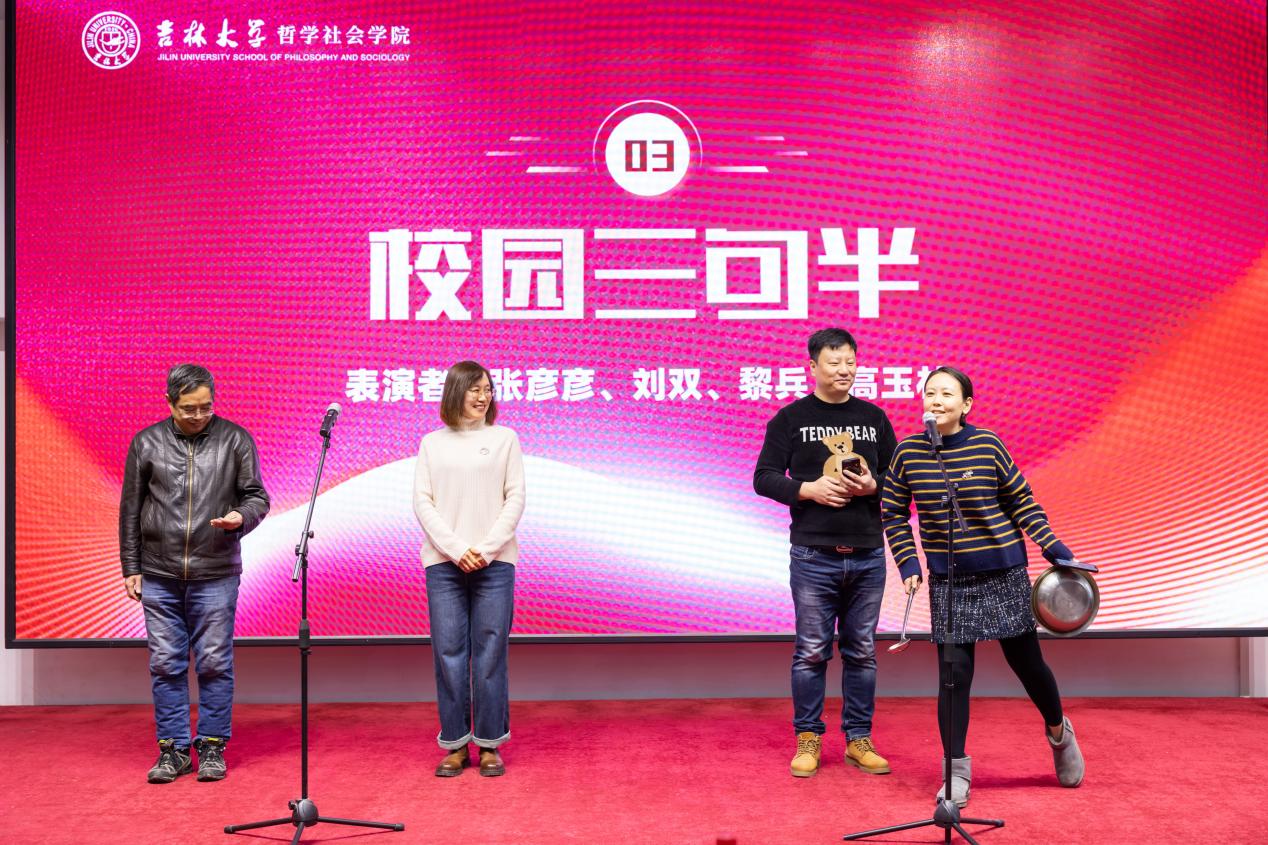 伴着歌声余音,张彦彦、刘双、黎兵、高玉林四位老师为大家带来精彩的《校园三句半》表演,从操场的趣闻、课堂的逸事,到新年的祝愿、来日的祝福,老师们以幽默有趣的口吻、轻松欢快的节奏引爆全场,在愉悦之余更有那一抹校园的羁绊始终牵连着你我。