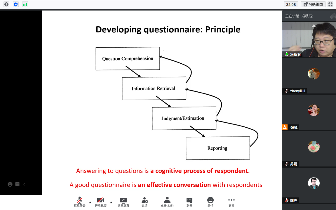 最后,冯老师以其自身对于中国农村老龄群体的健康状况的调研及研究经历作为举例,向与会师生详述了在这一主题下,从样本选取、数据收集的逻辑到研究问题聚焦、再到数据分析及量化结果的产出的整体过程,并对中国乡村振兴中及城市化背景下,老龄宜居型社会的建构与预防型老年医学转向提出倡导和建议,引发听众深思。