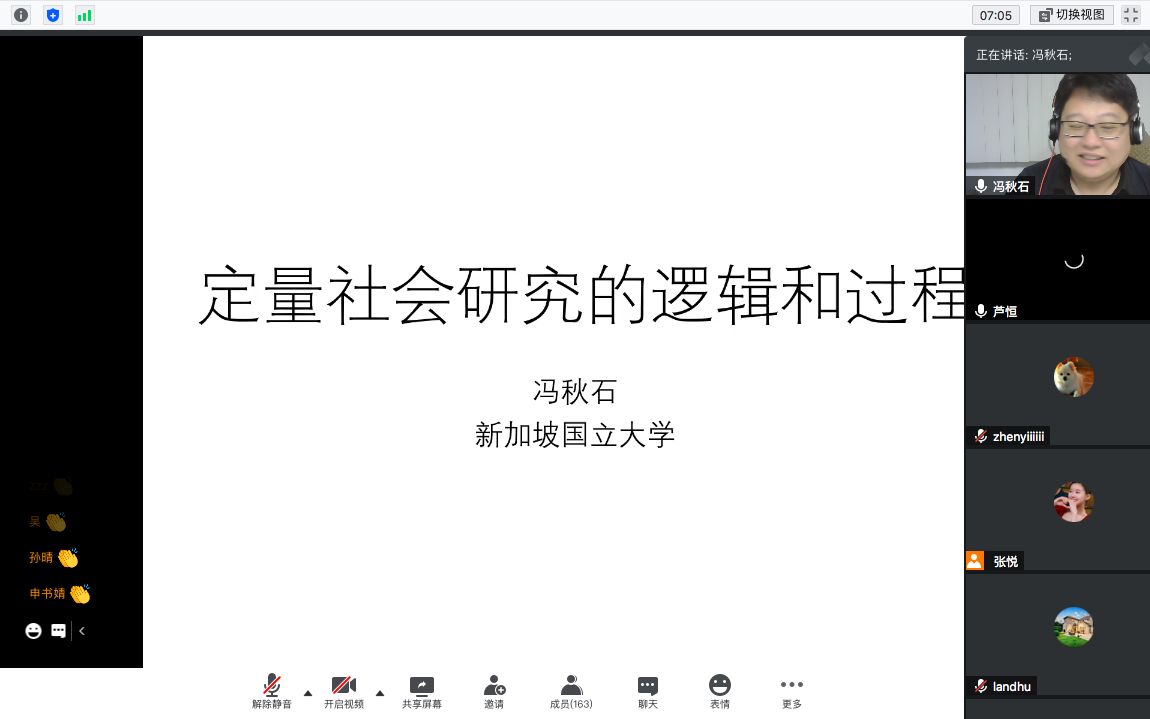 第96场名家讲座通过腾讯会议的形式在线上举办。新加坡国立大学社会学系副教授、家庭与人口研究中心副主任冯秋石,为线上会议室及直播间共计200余名师生作了题为《定量社会研究的逻辑和过程》学术讲座。芦恒副院长主持本场讲座。