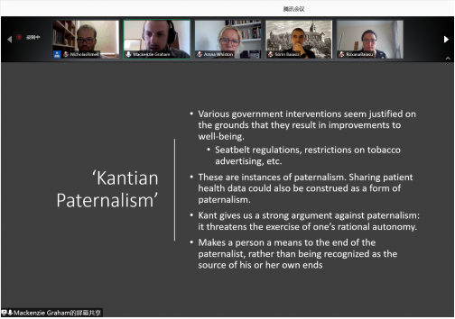 Mackenzie Graham博士以“Date for Sale: Does Selling Patients’ Health Data Use Them as a Mere Means?”为题进行报告,探讨有法律基础的数据共享是否道德。他从康德绝对命令的第二公式(人性公式)入手,认为现实生活中的大多数数据共享并不存在告知-同意的环节,只把人作为手段来对待。他认为存在一种康德主义的家长主义(Kantian Paternalism),其核心观点在于外在干预并不必然损害个人的自主性,存有一些干预行为反而可以帮助我们达成理性选择的目的。