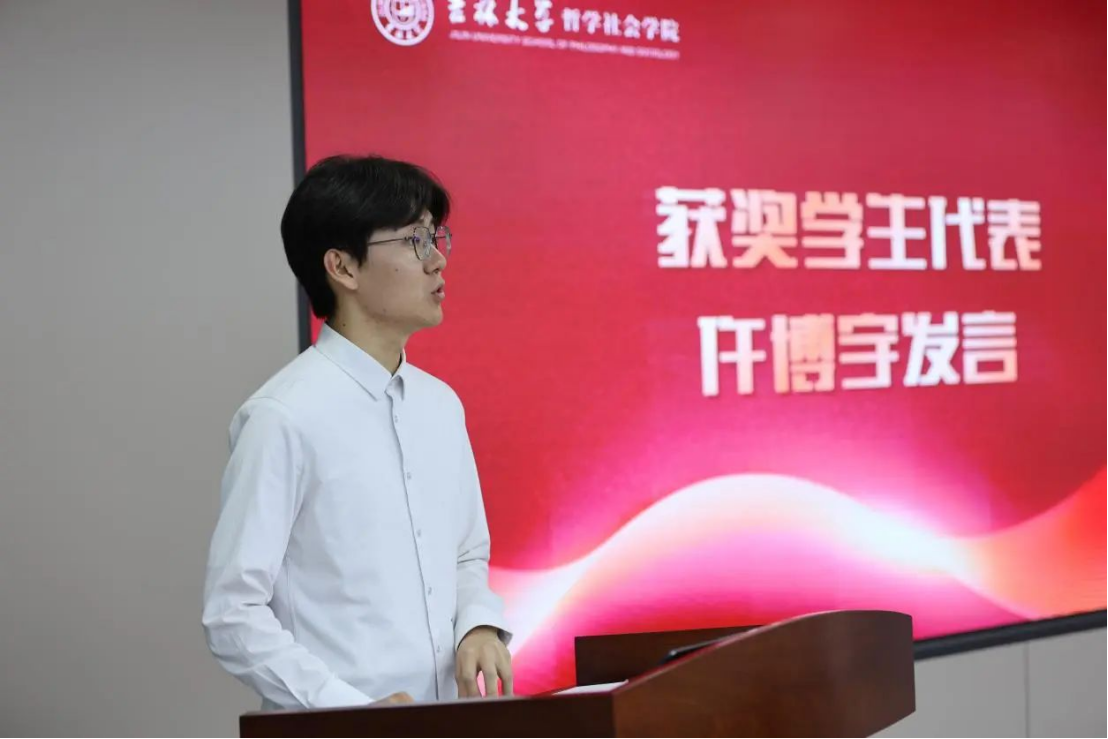 大会第五项,获奖学生代表、2020级本科生仵博宇同学发言。他情真意切地提到,衷心感谢学院领导老师们长期以来对同学们的无私关心和倾情帮助。一路走来,正是学院所提供的广阔平台、无处不在的人文情怀以及浸润人心的思想精神给予了同学们奋斗的底气和前进的力量。继往开来,同学们将以微芒造炬、萤火成光,携哲社的精神、品格与气质,为国家建设有一分光发一分热。