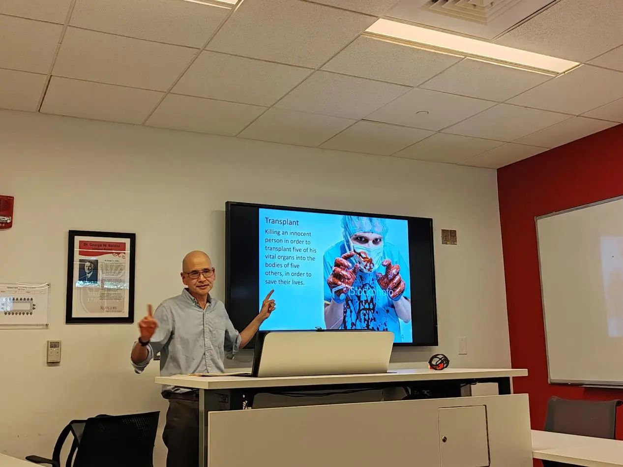 上午,Michael Otsuka教授为同学们带来题为“The Ethics of Harming and Helping”的讲座。讲座主要分为两部分,在课程前半段,Otsuka教授通过对伦理学学界内著名的“电车难题”及其不同变式进行分析、对比和解释,引发了同学们对于“伤害与救助”这一主题的思考。在课程的后半部分, Otsuka教授以安乐死问题为核心,将各个国家对于安乐死的不同态度进行了分类。师生们探讨了安乐死这一议题背后所蕴含的更加普遍的道德问题,即“杀戮(Killing)是否比任凭死亡(Letting Die)在道德上更糟糕”,同时,对这一问题的探讨也是对哲学伦理困境现实应用的反思。同学们在课上各抒己见,课堂氛围既严肃又活泼。经过与Otsuka教授的充分讨论与交流,同学们对于经典的伦理学问题的思考视角得到了进一步拓展,打开了新的问题空间。