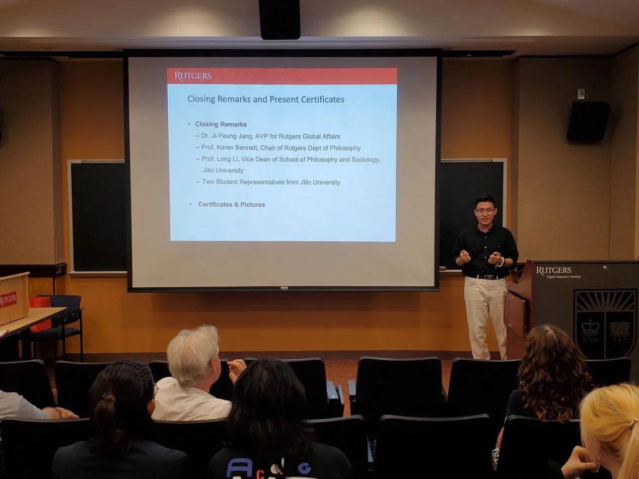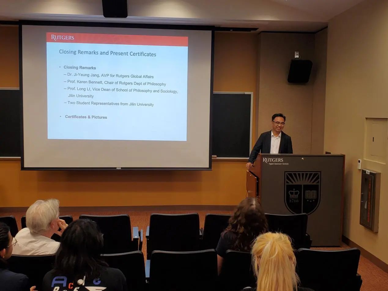 对罗格斯大学表达了感谢,特别是对罗格斯大学副校长Eric (Rick) Garfunkel、罗格斯大学全球事务助理副校长Ji-Yeung Jang博士、罗格斯大学哲学系系主任Karen Bennett教授、哲学系各位教授,以及Shuman Wen老师表示感谢,他们为本次暑期活动付出了巨大的努力。李龙教授还表达了对同学们的欣慰和自豪,并为未来同罗格斯大学的合作进行了展望,同时邀请罗格斯大学哲学系的老师访问开心鬼传媒