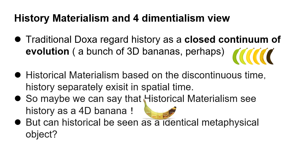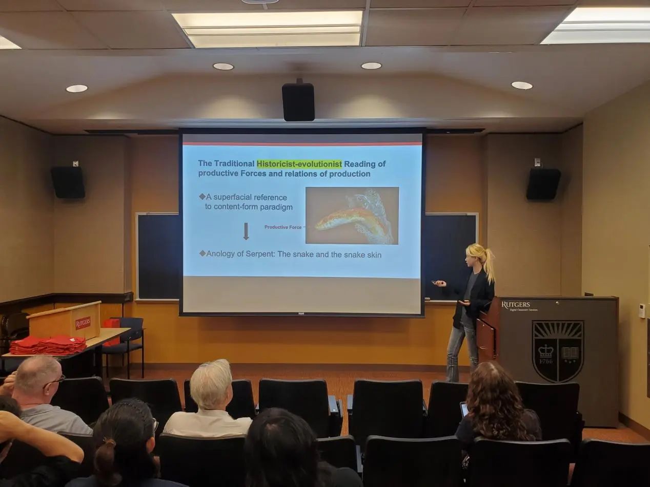 本次汇报主要解决齐泽克在《意识形态的崇高客体》一书中对历史唯物主义的重新阐释,并将其与四维主义的本体论立场缝合,将四维主义对时空观的探讨与历史唯物主义对历史的切割能力相联系。汇报集中探讨了齐泽克对传统历史唯物主义中的进化主义与历史主义色彩的批判,并通过强调生产条件的优先性,发掘历史唯物主义对历史书写的切割能力,从而理论上解释了在历史唯物主义进路中,革命回溯性拯救历史的可能性。