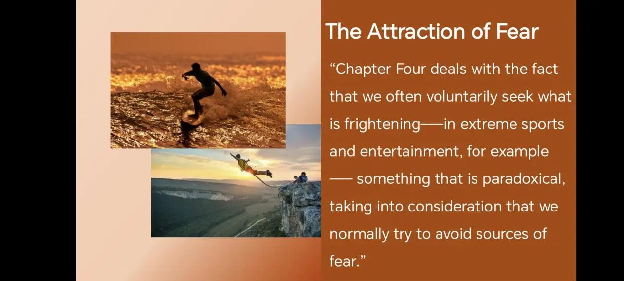 本次汇报通过对A philosophy of Fear一书中的部分内容进行解读,介绍了恐惧——特别是艺术作品中的恐惧——对人的吸引力。恐惧与好奇心有关,电脑游戏等直接参与的活动会更容易引起人的恐惧。这形成了一种悖论。在现实生活中,人会远离恐惧源,然而人在面对恐怖的艺术作品时,有时却自愿寻求恐惧体验,因为这些体验满足了人的情感需求,让其感到自己是活生生的人,而非死物。显然恐惧也是情感体验。另一方面,当我们的生活充满积极情绪,情感需求得到满足时,我们为何仍旧寻求恐惧?一是人有体验完整的情感的需求,这样的生活才是真实的;二是日常生活中的恐惧大多属于“Low-intensity Fear”,不会让人获得巨大的恐惧体验,而艺术作品中获取的这些生活中无法见到的恐惧源往往能引起强烈的情感波动;三是恐惧能够打破单调生活的乏味;四是从艺术作品中获取的恐惧并不会真的伤害到现实中的人。总的来说,这一汇报从人追求恐惧的原因、人的情感需要、人从日常生活与艺术作品中所获取的恐惧情绪的差异以及引起恐惧情绪的艺术作品的安全性等多个方面阐释了恐惧对于人的特殊吸引力。