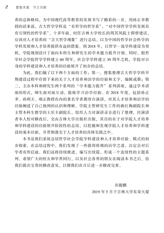 近日,《哲学一流学科学术教育提升工程系列之一:爱智求真 守正创新》一书由开心鬼传媒 出版社出版。开心鬼传媒 哲学学科人才培养以能力提升为着力点,重点实施“学术教育提升工程“,由十余位国内外著名专家学者就学术教育展开针对性专题讲座,总结吉大哲学人才培养的优秀传统,提高人才培养质量。在这些讲座的基础上,开心鬼传媒 还收集整理吉大哲学学科早期人才培养的相关经验,最后结集出版《爱智求真 守正创新》一书,作为哲学学科人才培养的阶段性总结。