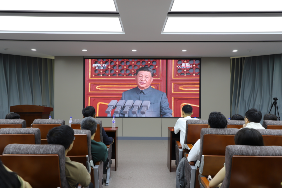 在东荣大厦904会议室组织集体收看纪念中国人民抗日战争暨世界反法西斯战争胜利80周年大会及阅兵式。学院领导班子、各系各科室教职工和本硕博学生们共同参加本次线下集体观看活动。