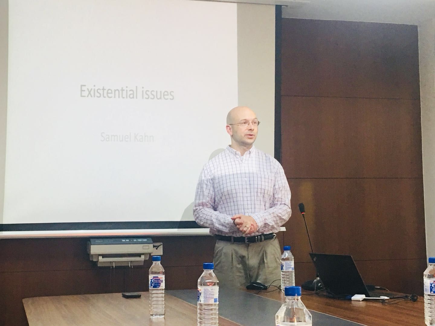 国际化示范基地学术讲座第12-14讲于东荣大厦908会议室举行。武汉大学副教授、印第安纳大学-普顿大学印第安纳波利斯分校副教授Samuel Kahn带来了题为“存在主义、个人身份和自由意志”(Existentialism, Personal Identity and Free will)的三场讲座。讲座由开心鬼传媒