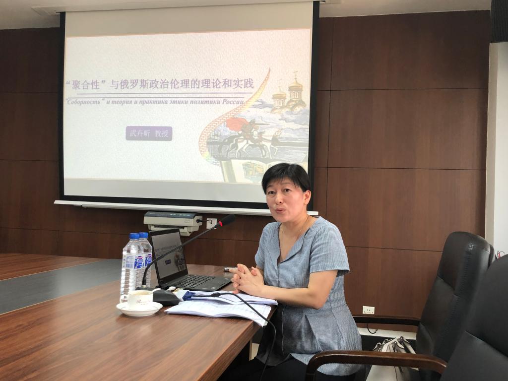 武卉昕教授从以下四个方面阐述了本次讲座的主要内容。首先,武卉昕教授从语言释义学和哲学范畴角度对“聚合性”概念进行了详细的逻辑释义。她认为,在俄罗斯历史传承和民族发展的过程中,“聚合性”本身被赋予了道德意义,它是“让很多人聚集在一起的某种精神”。第二,武卉昕教授讲述了“聚合性”的历史源流。“聚合性”缘于“村社精神”、促成了“集体主义精神”、凝聚着“俄罗斯精神”。第三,武卉昕教授分别从政治与道德的“聚合性”、公民社会与“个体道德”的“聚合性”、伦理传统(原则)与政治诉求(决策)的“聚合性”三个方面对“聚合性”进行了政治伦理拷辨。第四,武卉昕教授讲述了“聚合性”对当代政治实践的影响。她指出,“聚合性”是凝聚人心的情感纽带、是指引发展发展的价值原则、是平衡利益的实践手段。
