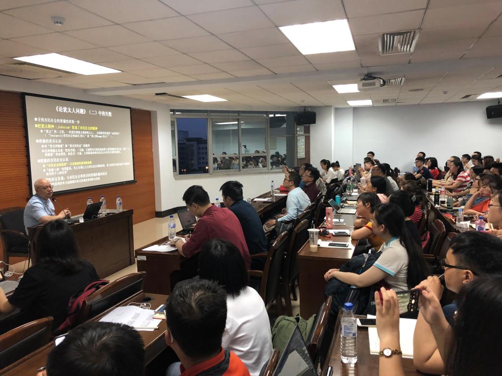 韩立新教授第一讲“从国家到市民社会”解释了关于青年马克思解释的三种模式、“卡尔·马克思问题”、马克思从国家到市民社会的思想转变、马克思问题意识发生转变的原因、为什么需要政治解放等问题。最后,他引用恩格斯《卡尔·马克思》“关于市民社会的科学,也就是政治经济学,而当时要切实地研究这门科学,在德国是不可能的,只有在英国或法国才有可能”作为结论。