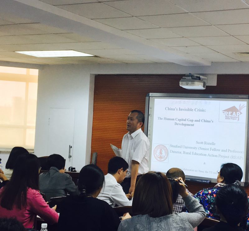 SCOTT教授通过大量的调研数据和科学的定量数据分析方法,提出了中国农村人力资本发展的关键在于0~3岁农村孩子认知能力的提高,而可以显著提高这种认知能力的方法就是对孩子的科学养育,这需要孩子的母亲接受专业的养育子女课程的培训,这种专业培训对孩子的认知能力的提高以及中国未来农村人力资本的发展具有十分重要的作用。SCOTT教授的精彩报告,使在场的师生收获满满,受益非浅。