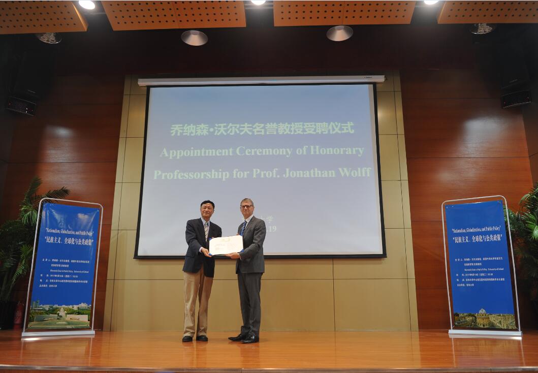 校徽。随后,沃尔夫教授做了题为“民族主义、全球化与公共政策”的学术讲座,提出当前英美国家民族主义有复兴趋势,我们需要共同审视这种复兴是否是合乎道德。他阐述了全球化在民族主义复兴中的作用,并预测了美国带有民族主义特色的公共政策的命运。讲座内容紧贴当今世界形势,引人深思,使在场听众受益匪浅。
