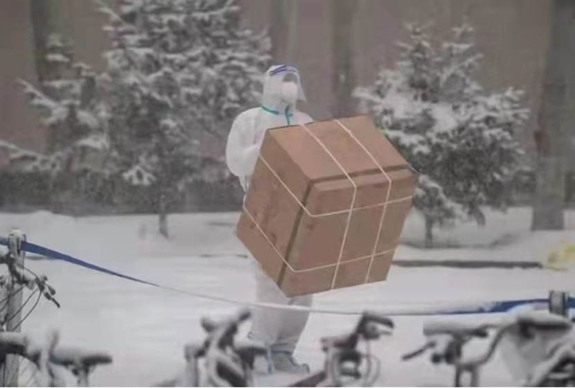 接着,作为学校物资保障组的成员,于士博老师也简要汇报了工作情况。物资保障组主要负责南区22栋公寓楼,3万多名学生的防疫物资等物品的配送工作。他们经常是早出晚归,顶风冒雪,24小时全天待命。他们每日穿梭在南区各个楼宇之间,肩扛手推,截至目前累计配送防疫物资数万余件,同事们戏称他们是南区快递员。
