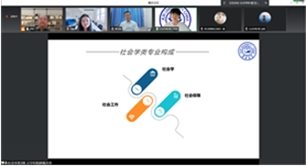 交流会进入第二个环节,同时也是最关键的环节——医文交叉主题讨论:健康中国战略。临床医学专业的王玥珂同学就疫情防护、健康管理两方面做了介绍;社会学类专业的闰筱钰同学结合本专业介绍了医疗社会学与医务社会工作,及其在疫情防控中的实践与作用,同时就本学院学生医务社会工作的实践进行了举例说明。芦老师做总结发言指出,通过两位同学的交流,可以明显发现两个专业在较多方面可以互相合作融合,特别是可以在基层城乡社区开展精准医疗服务工作。