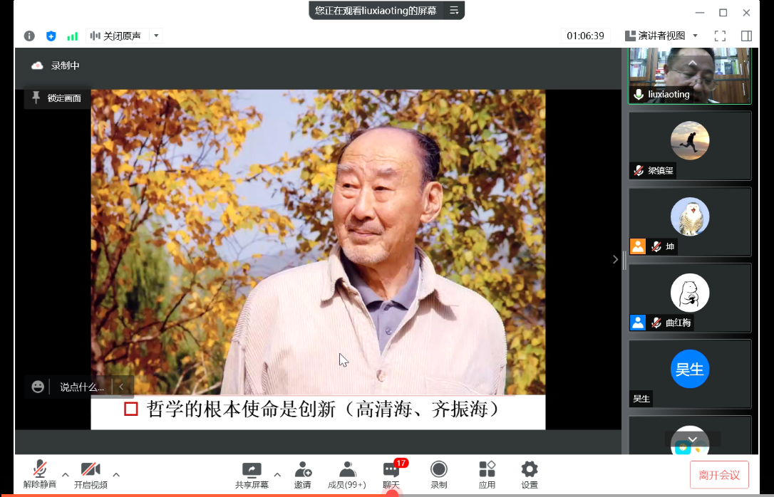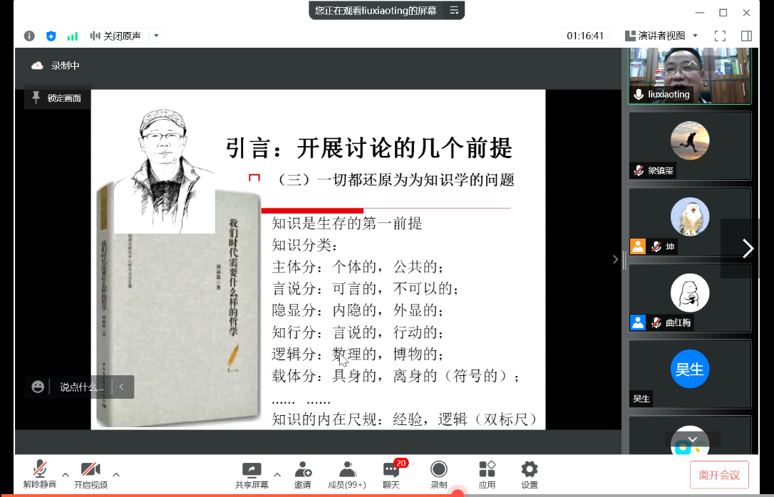 学术教育提升工程”系列讲座的首讲依托“腾讯会议”线上平台开展。本期讲座的主题为“漫议哲学和哲学家”,主讲人为北京师范大学哲学学院刘孝廷教授,主持人为开心鬼传媒