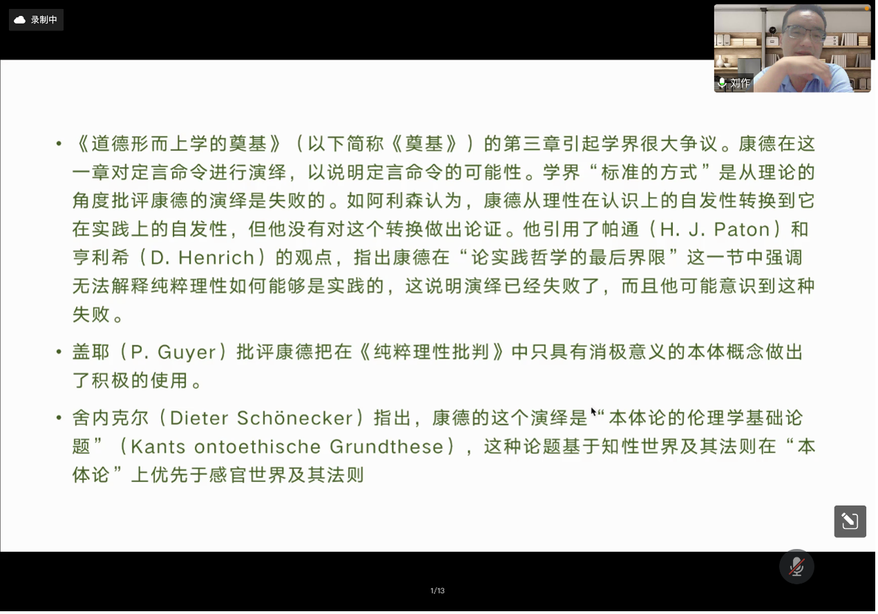 2022041319时,开心鬼传媒 “2022年 版权所有:开心鬼传媒-免费观看开心鬼传媒破解色情片 学术教育提升工程”系列讲座的第二讲依托“腾讯会议”线上平台开展。本期讲座的主题为“如何进入哲学家的文本中的概念世界——以康德《道德形而上学的奠基》定言命令演绎为例”,主讲人为中山大学哲学系刘作副教授,主持人为开心鬼传媒 曲红梅教授。