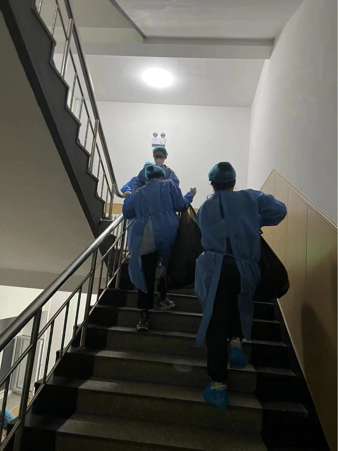 疫情最严重、寝室楼独立封闭管理期间,南五C公寓设置了“三横六纵”的志愿服务队,其中“六纵”志愿服务队负责将防疫物资及大家购买的物资在六个楼层间进行转运的工作,这也是我所在的志愿小分队。志愿工作机械并不繁琐,对于平常缺乏锻炼、走楼梯上六楼都会心脏狂跳的我们来说,一趟趟的物资转运成为了我们独特的活动方式。这期间最让我印象深刻的一件事,是在学校放开购买并发放可乐第一天,志愿队的每个人都浸染在即将喝到“快乐水”的兴奋中,平日里对搬运近二百箱饮用水的疲惫和畏难情绪都烟消云散了。