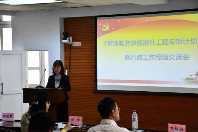 会议第二项,与会人员进行工作经验分享。首先,由学院党委办公室主任张洁老师上台发言。张老师以亲身经历作为切入点,向与会人员介绍自己的党务工作经验,表达了对于以后工作的预期目标。随后,学院行政办公室主任于海天介绍了自己的工作秘诀:以院为家、全心全意,以饱满的热情和踏实的态度投入工作,保质保量地完成各项工作。