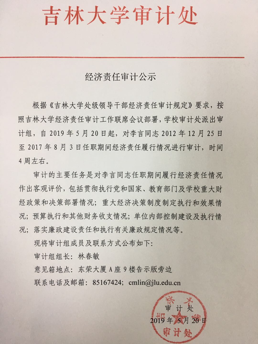 关于对李言经济责任审计的公示