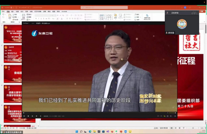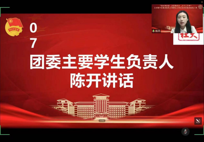 大会第六项,由学院团委新时代理论宣讲团向同学们进行授课。2022年10月16日至10月22日,中国共产党第二十次全国代表大会在北京人民大会堂举行,在党的二十大顺利闭幕后,全国上下、社会各界掀起了学习、热议二十大报告,感悟、发扬二十大精神的热潮。“学习新思想,争做新青年”,同学们集体观看了党的二十大精神相关学习视频开展学习。