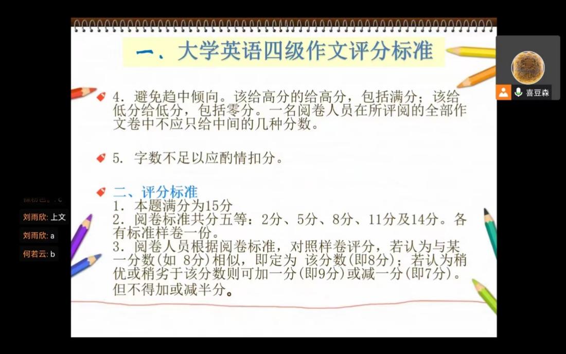 2、评分标准:老师为同学们详细介绍了英语四六级作文的评分标准,并依据阅卷标准将作文划分为五个等级,结合案例为同学们进行具体解析。