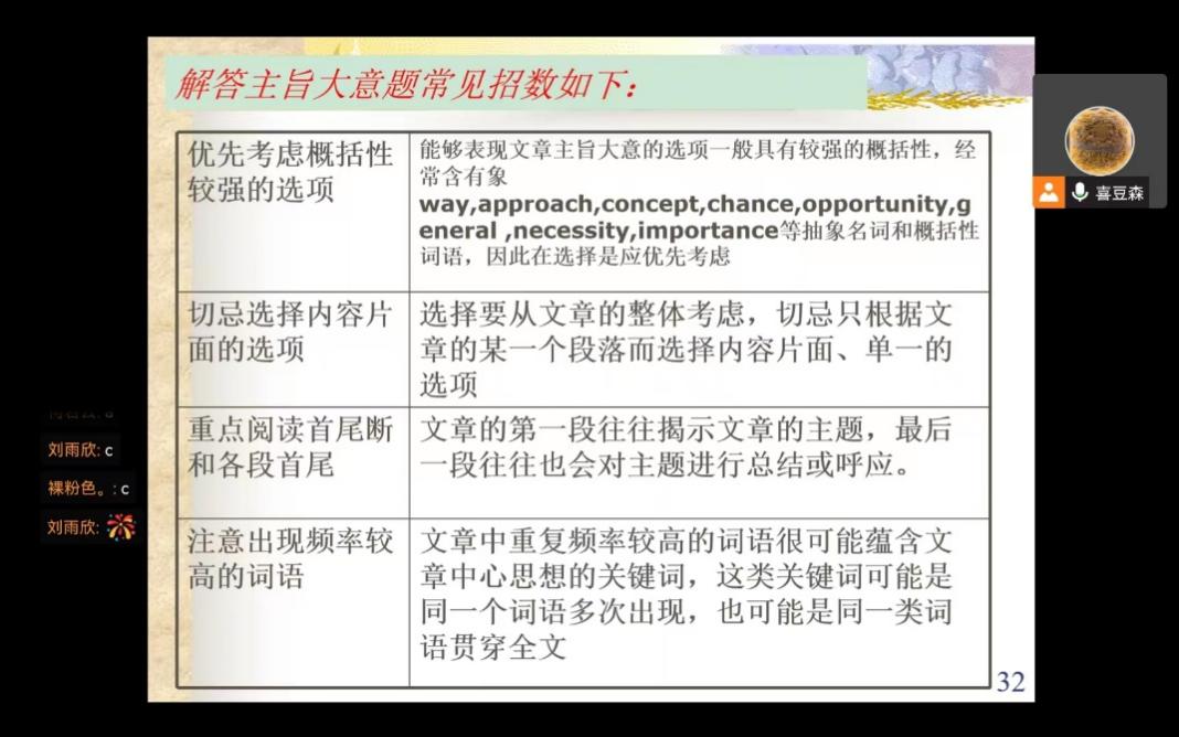 3、题型分析:老师为大家梳理了阅读过程中出现的常见题型,例如词义题、主旨题、推理判断题等等。紧接着,老师带领同学们进行了细致的真题练习,大家积极回答,学习热情高涨。