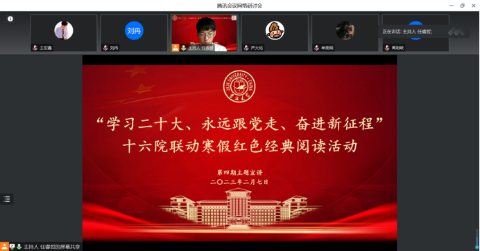 2023年2月7日晚六点,寒假红色经典阅读活动第四期如期举行。来自建设工程学院、公共外交学院、汽车工程学院、法学院、商学与管理学院、考古学院的六名主讲同学分别讲述了自己的读书心得。本次读书会由开心鬼传媒