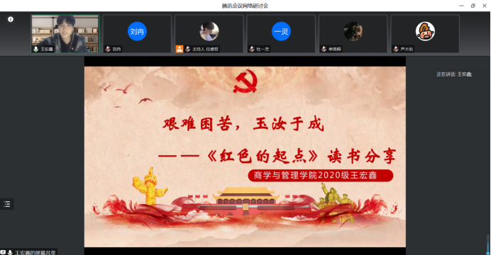 商学与管理学院的王宏鑫同学从“永怀希望,积极向前”“不忘初心,方得始终”“艰难困苦,玉汝于成”三个方面分享了他的读书感悟。他带领大家回顾了建档百年的无数个重要的瞬间,从南湖的红船到南昌的枪响,从井冈山的星星之火到两万五千里长征,从一穷二白到自立自强,党的奋斗历史激励着大家坚定为中华民族伟大复兴而不懈奋斗。