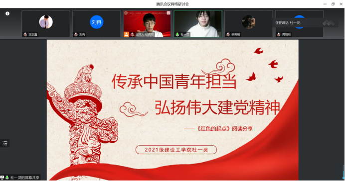 建设工程学院杜一灵同学分享的主题是“传承中国青年担当,弘扬伟大建党精神”。她号召大家不畏艰难,勇攀高峰,心系家国,以青春之我创建青春之国家,以积极乐观向上的态度面对生活,努力奋斗,传承中国青年担当,弘扬伟大建党精神。
