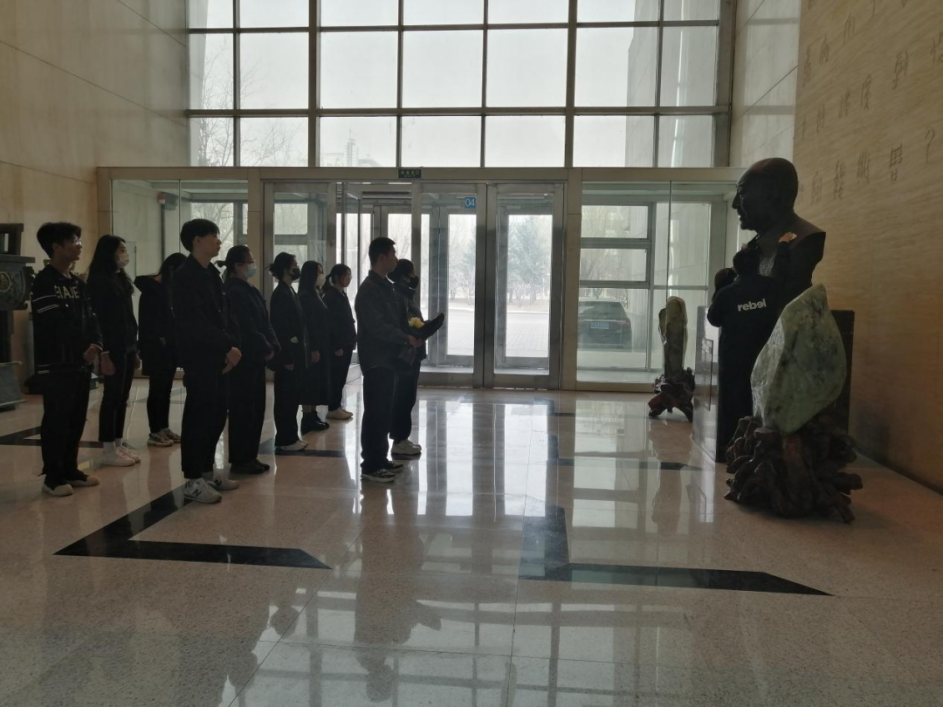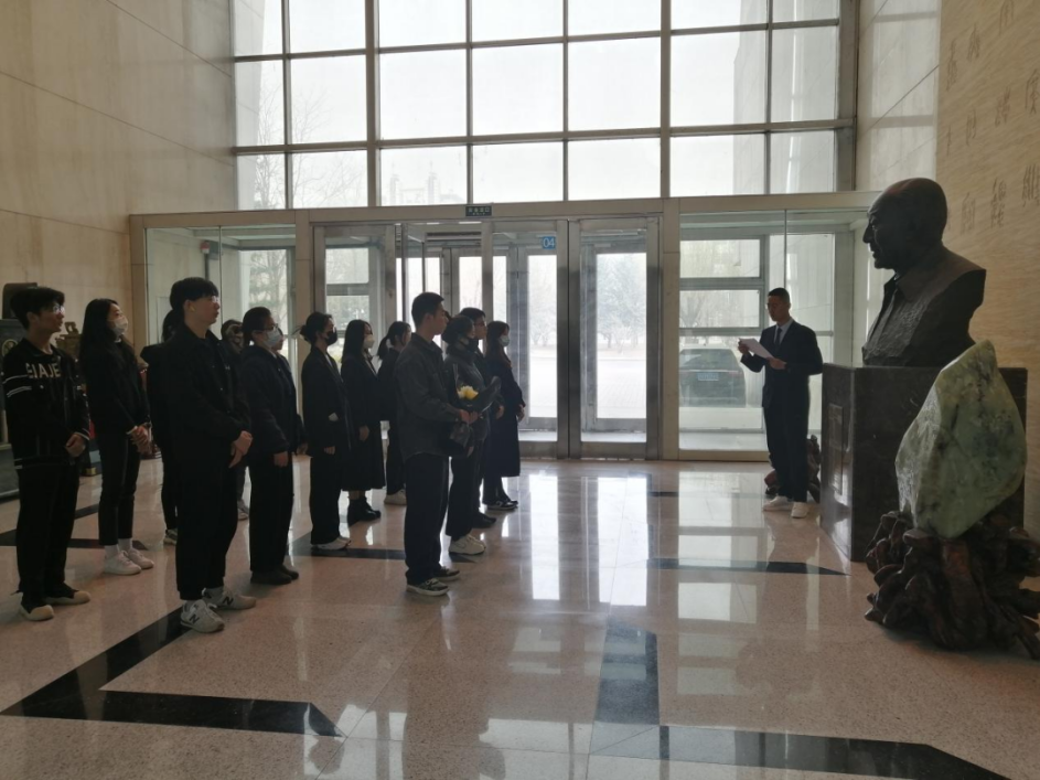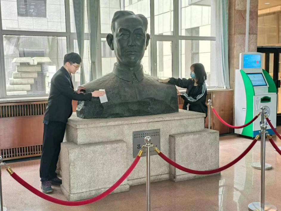 同学们认真聆听着主持人同学们的讲解,仔细感受着从文字中浮现出的学术先贤们的奋斗岁月。随后,学生代表们分别上前擦拭雕塑、献花。