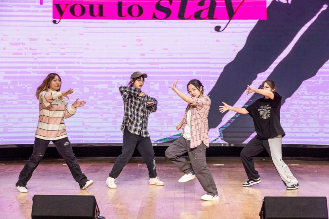 这也许是人生中距离K-POP最近的一次?辅导员宋绍伟老师和来自2020级的王梓铭、曾辞源两位同学共同跳起了“三哈”舞,可爱的舞姿和律动的音乐再次将全场的氛围烘托到高潮。台下的观众纷纷举起手机,留下这宝贵的精彩瞬间,笑容在台下每位观众的脸上停留。