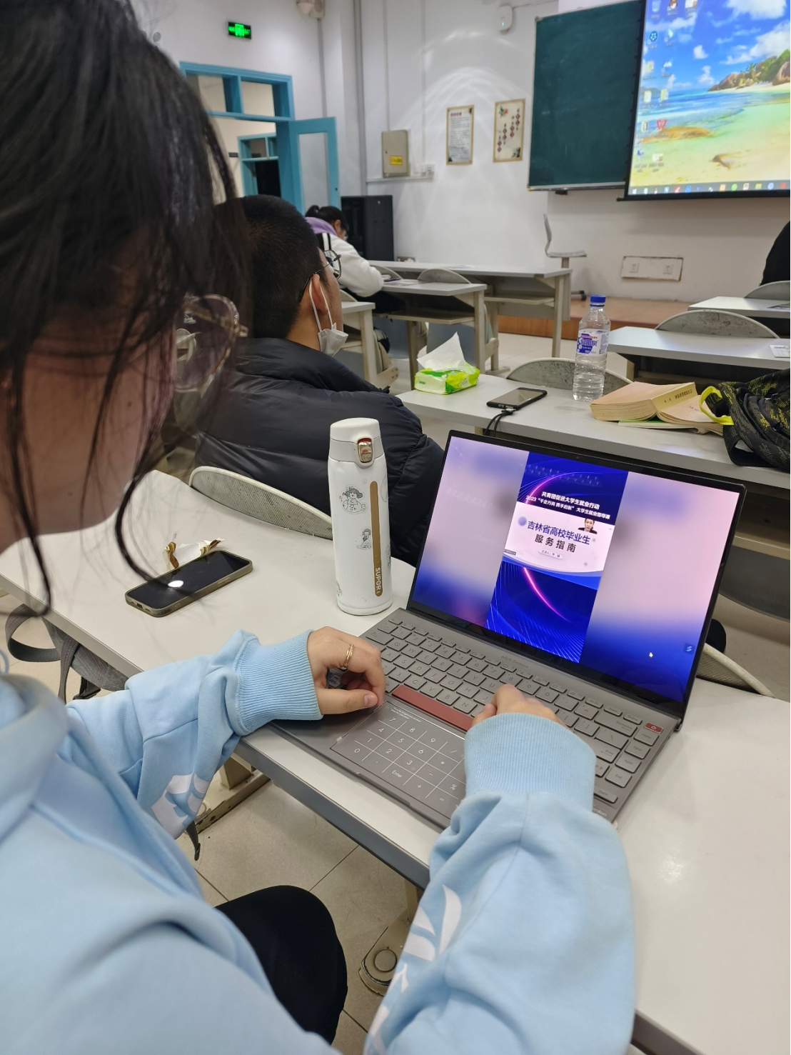 在课程学习中,同学们认真倾听着两位课程讲师的授课内容,初步认识了2023年第一季度大学生就业趋势,并从老师提出的三点建议出发,思考求职前如何结合自身情况做详细准备。同时,老师针对吉林省青年就业见习政策和大学生实训基地政策的解读,也使得同学们进一步了解青年在吉工作的发展前景。