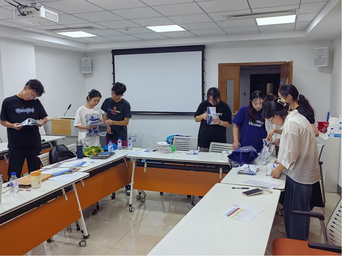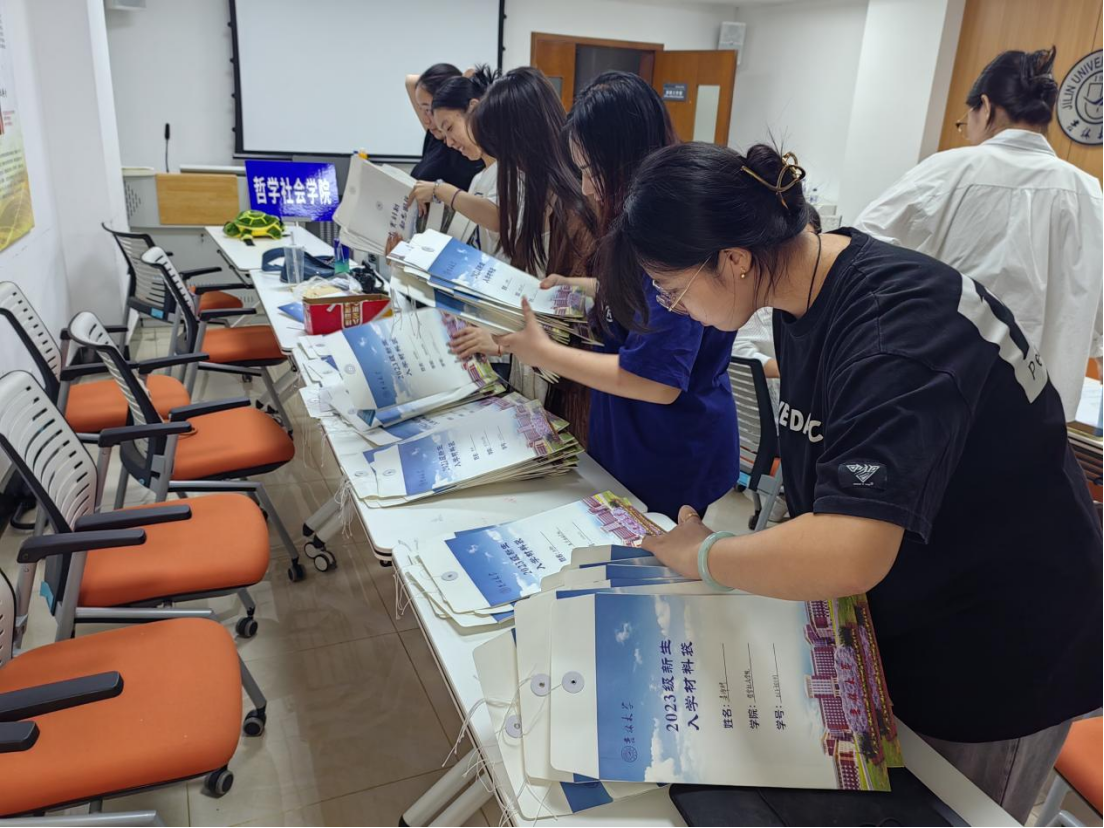 新生人数较多,报到时间相对固定的实际情况,宋老师和同学们将领取的材料进行有效分类整理,并按照门类列出清单,逐一核对放入新生报到时领取的材料袋中。