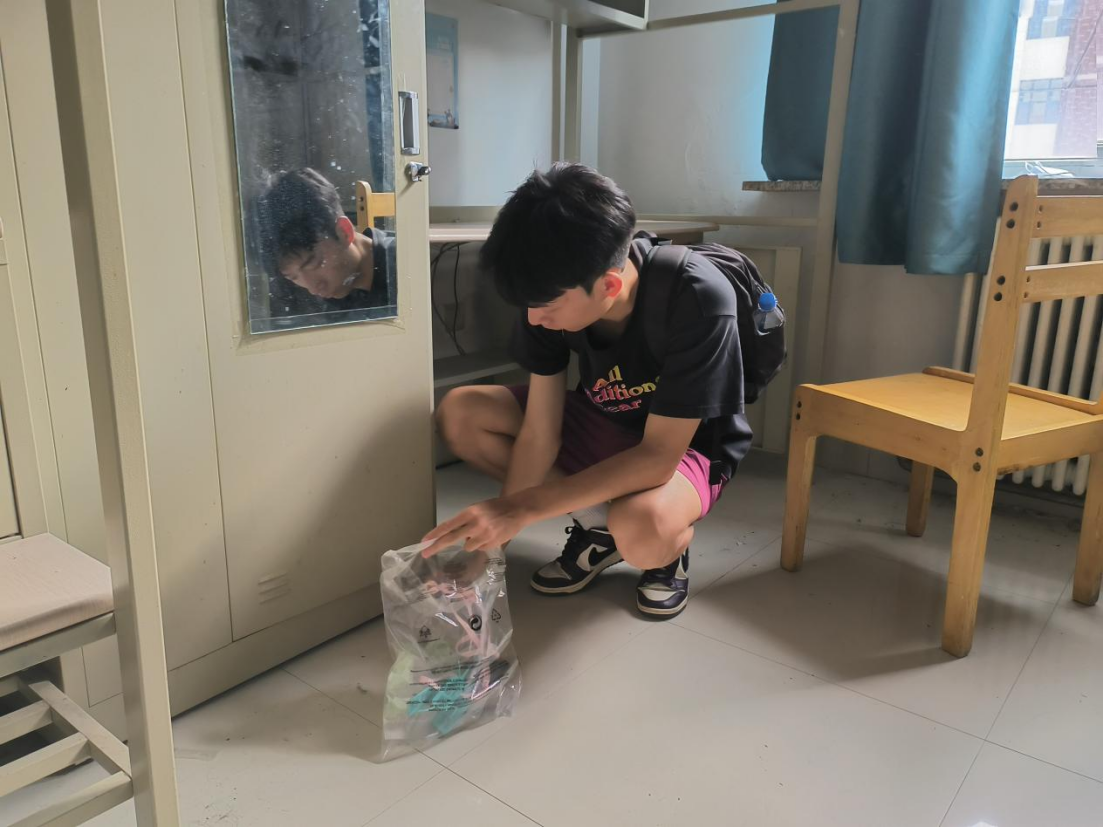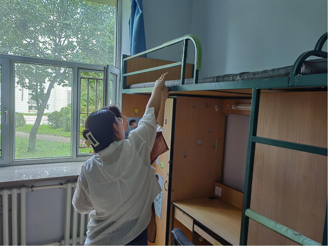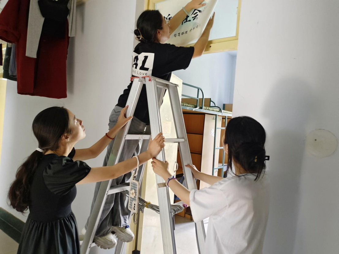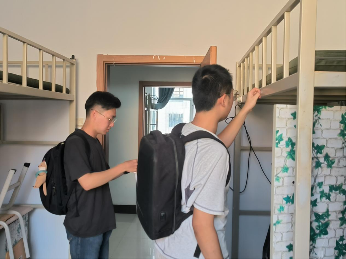 经过短暂的休整,宋老师和同学们来到宿舍了解新同学们的住宿情况。老师和同学们将早早设计好的学院标识和学生住宿标识认真张贴,仔细检查了寝室硬件设施,发现问题向宿舍管理人员及时求助解决。同时,师生们利用已有的清扫工具对新同学们的宿舍进行了打扫整理,为新同学营造卫生干净的住宿环境。