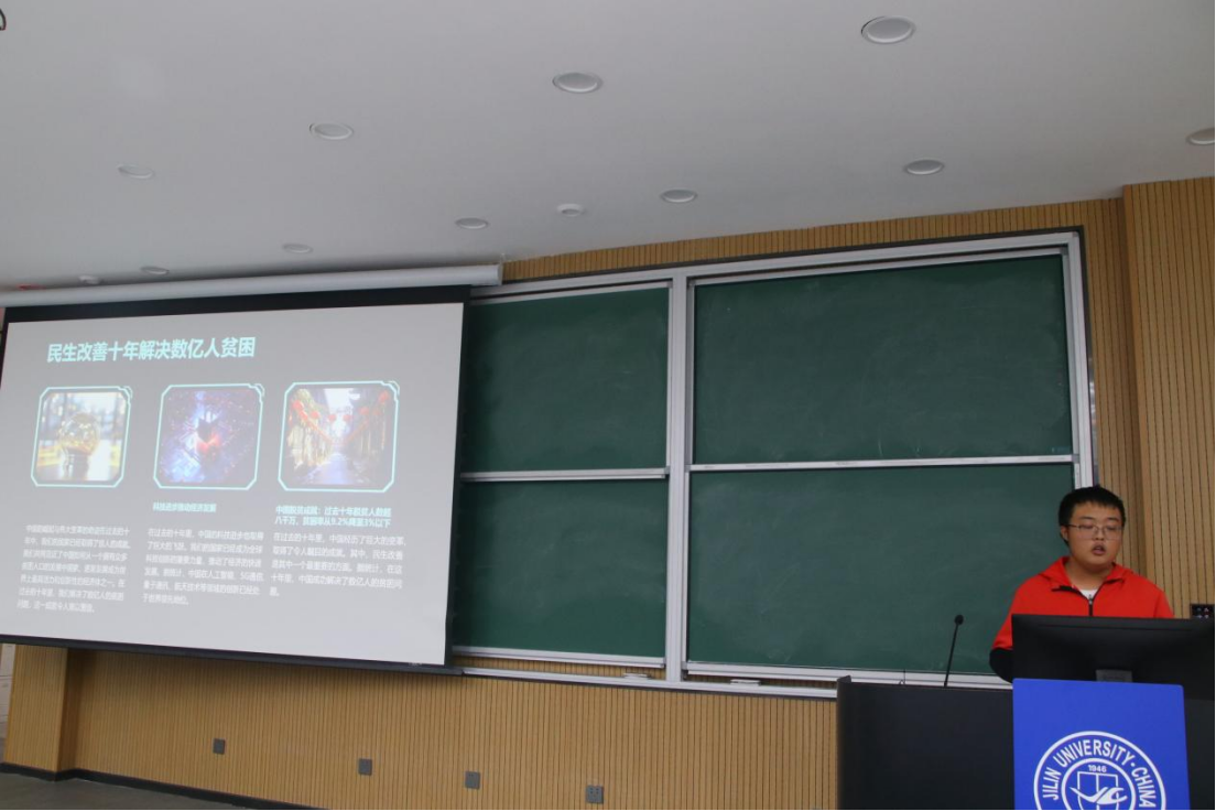比赛开始,各位选手深入学习感悟新时代十年的伟大变革,从不同角度进行了生动讲述。王浩儒同学以“在奋进的中国中寻找答案”为主题,从“有什么”“为什么”“怎么做”三个方面,结合个人事迹、集体事业、国家全局三个维度,鼓舞同学们携手共进,不断开辟“中国之治”新境界。宫佳雯同学以“诵咏变革经义,点燃图强之灯”为主题,从回顾“新时代十年伟大变革成就”入手,讲述了伟大变革的里程碑意义,以榜样力量激励同学们以青春之姿昂扬挺进于中华民族伟大复兴的历史征程中。沈天航同学以“踔厉奋发新时代,不负韶华赴新程”为主题,从“十年之变——自信之源”与“十年之路——自强方向”等两个“十年”维度,讲述了“我辈应当传承先辈们,谱写我们自己的时代新篇章”的历史应然与时代必然,并鼓舞同学们一道携起手来,提升自我,争做新时代的弄潮儿。孙海明同学以“争做新时代青年,贯彻新发展理念”为主题,以“五分话十年”的创新形式,为大家生动讲述了新时代十年伟大变革背后新发展理念所具有的深刻内涵与时代意义,并深情鼓励同学们要继续高举中国特色社会主义伟大旗帜,为全面建设社会主义现代化国家而团结奋斗。