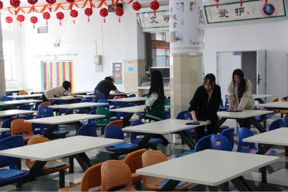 在活动负责人的带领下,同学们分工明确,有序进行卫生清扫。同学们手持工具,仔细清理纸屑垃圾,耐心擦拭灰尘污渍,同时对用餐桌椅进行整齐排列,并在座椅上摆放好干净的坐垫。