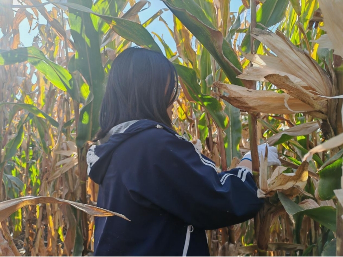 到达实践基地后,农业基地的相关负责教师引导同学们前往了自主研发品种试验田,并详细介绍了玉米、地瓜、花生等作物的生长过程,培育要点以及采摘方法。同学们认真聆听讲解,在做好劳动保护措施后分工明确,有条不紊地投入到了收获实践中。