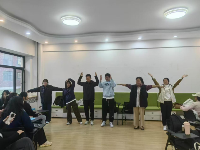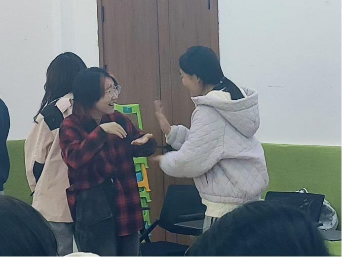 接下来,活动进入了人体字母的游戏环节,每组成员抽取一组单词,在组内进行讨论和分工,最终用身体合作呈现出这个单词,若有他组成员猜出,则视为挑战成功。同学们进行了激烈的讨论,展示时每个人都尽力的完成自己的演绎,最后在一片笑声中完成了各自的挑战。