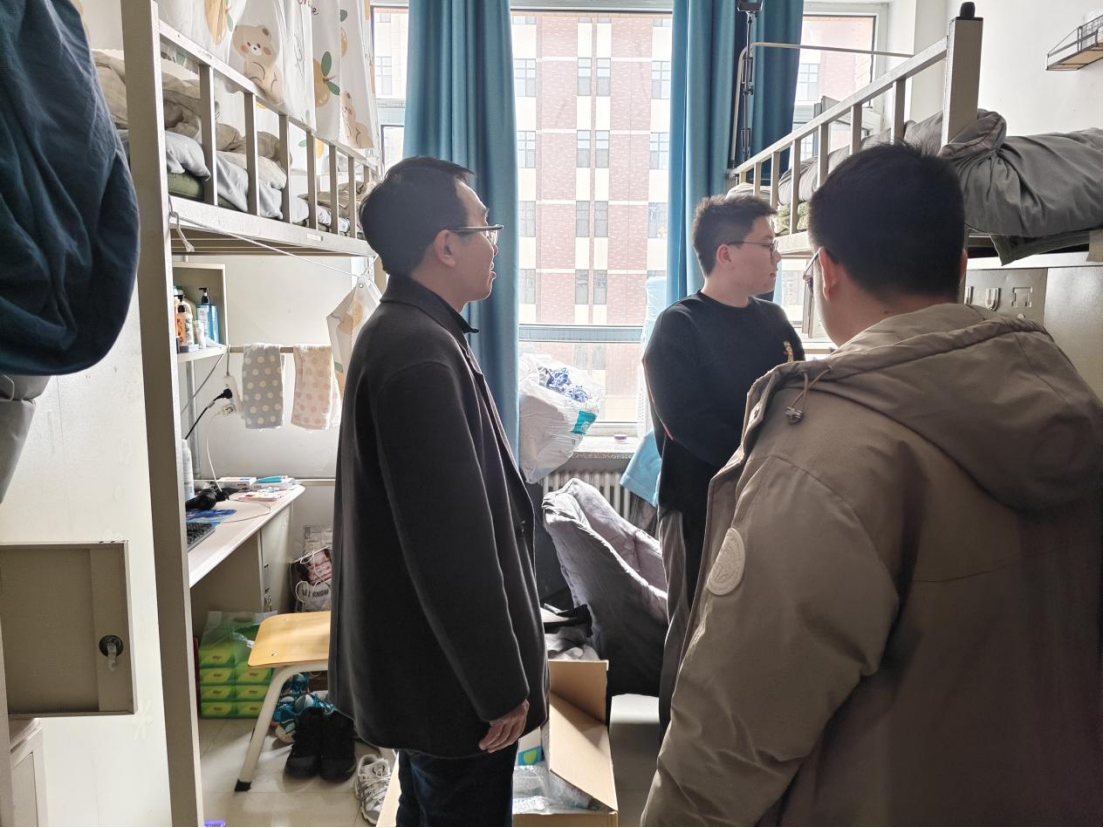 在寝室中,朱大卫老师向同学们亲切交流学习生活情况,详细了解同学们的个人基本信息和未来发展规划,同时认真宣讲安全知识,提醒同学们严禁在寝室使用大功率违规电器,外出务必做到断电断水;严禁夜不归寝,不要留宿外人。结合在走访过程中存在的卫生问题和安全隐患,朱大卫老师当场向同学们指出,并指导同学们进行马上整改。