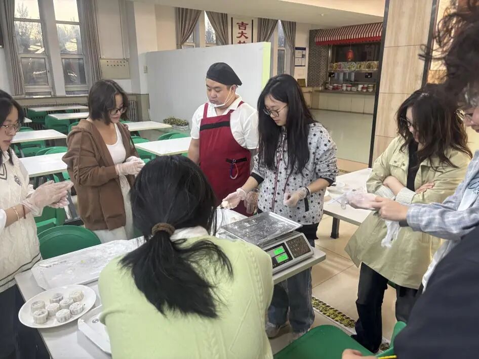 手工制月饼,品味传统食韵。“月饼寄相思,巧手蕴温情”,手工制月饼环节将中秋饮食文化与实践体验深度融合。学院特邀湖畔食堂面点师傅现场教学,从冰皮的揉制技巧、馅料的搭配比例,到模具压花的细致手法,师傅一一耐心演示,将传统月饼制作技艺倾囊相授。同学们自由分组围坐,在揉、捏、包、压的过程中,慢慢掌握传统手艺的精髓。原本略显生涩的动作逐渐熟练,一个个花纹清晰、形态精致的冰皮月饼接连成型,香甜的气息在空气中弥漫。这不仅是一次手工实践,更是对“中秋食月”传统习俗的鲜活传承,让同学们在亲手制作中品味传统美食背后的文化寓意,收获“自己动手,丰衣足食”的满满成就感。
