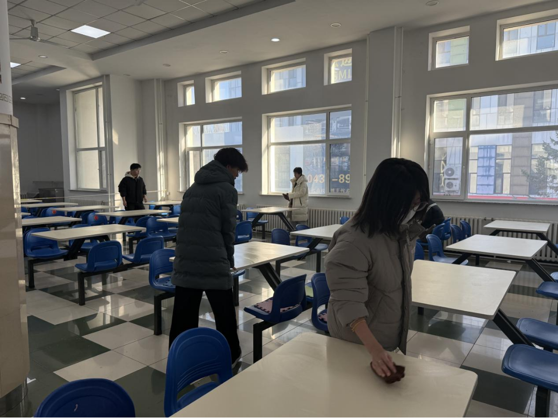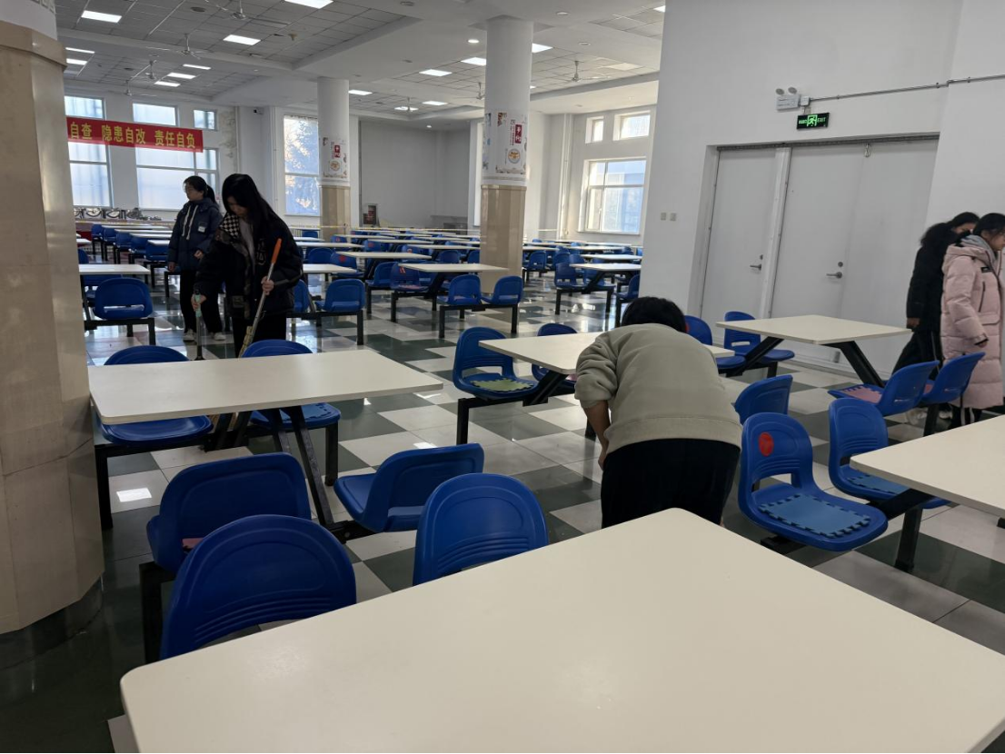 在清扫的过程中,同学们相互配合,团结协作。食堂里闪过同学们一个个忙碌的身影,从餐桌到地面,每一处角落都被同学们打扫得干干净净,大家以饱满的劳动热情挥洒汗水,并且在清扫结束后将劳动工具都放回到了原处,共同营造了一个整洁舒适的用餐环境,贡献了属于哲社的青春力量。