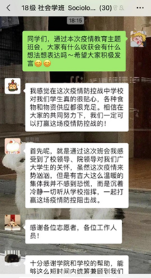 18级社会学班在主题班会上开展了民主讨论会,由班委同学带领全班同学一起讨论与疫情相关的话题:理性看待疫情;有效调节情绪;保持良好心态;健康规律作息,同学们积极分享各自的看法。其次,同学们共同阅读了防疫知识手册,引导大家放下手机、正常作息,保持良好乐观的情绪,鼓励同学们做些适当运动,缓解精神紧张,调整心态。